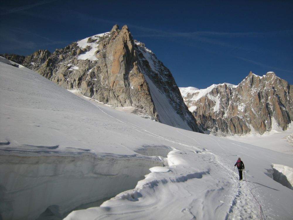 Знаменит он тем, что с острого гребня восходители любуются по очереди знаменитейшими стенами Гран-Жорасса с одной стороны, и южными стенами Монблана с другой стороны.