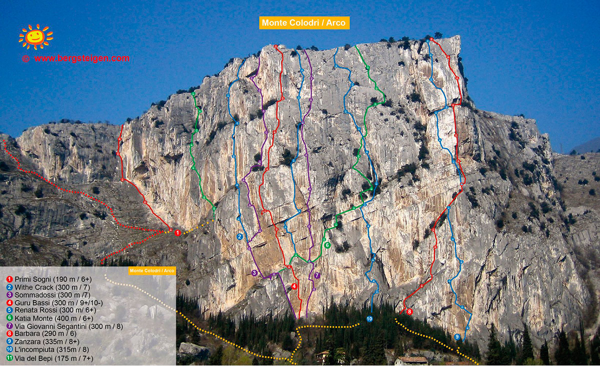 Стена San Paolo расположена к северу от Monte Castelo и Monte Colodri, возвышающихся над городком Арко.
