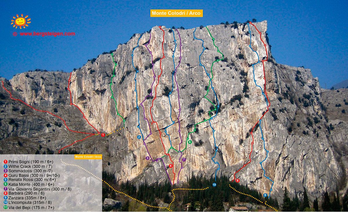 Самый левый и самый простой маршрут на стене Monte Colodri, "Первые мечты", довольно безопасно оборудован, но в то же время требует своей страховки в некоторых местах. С него открываются виды на грандиозные карнизы Южной стены Колодри.